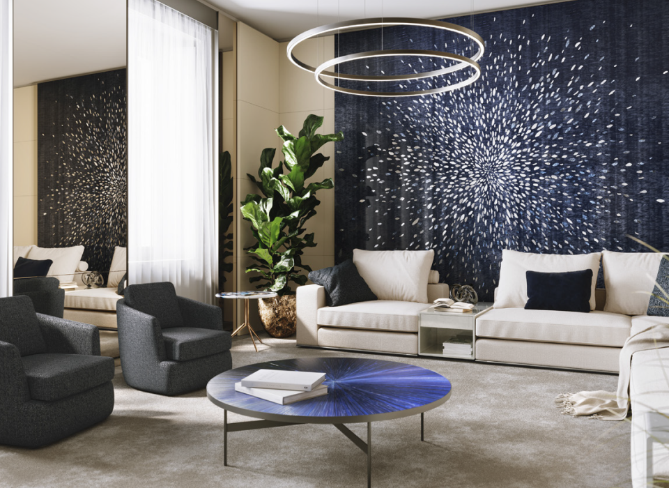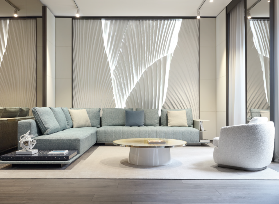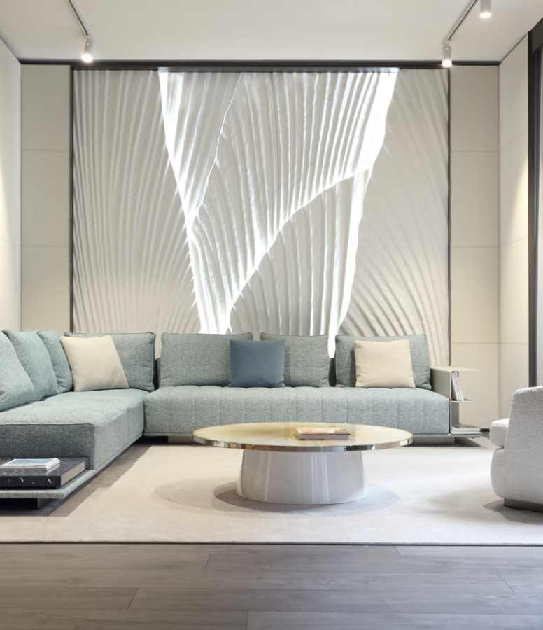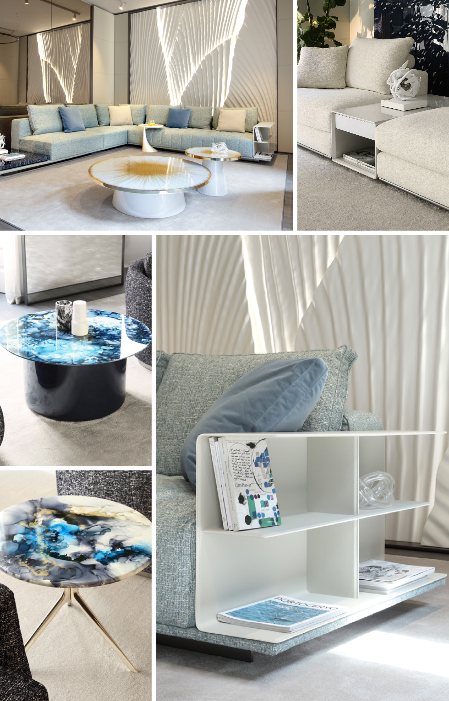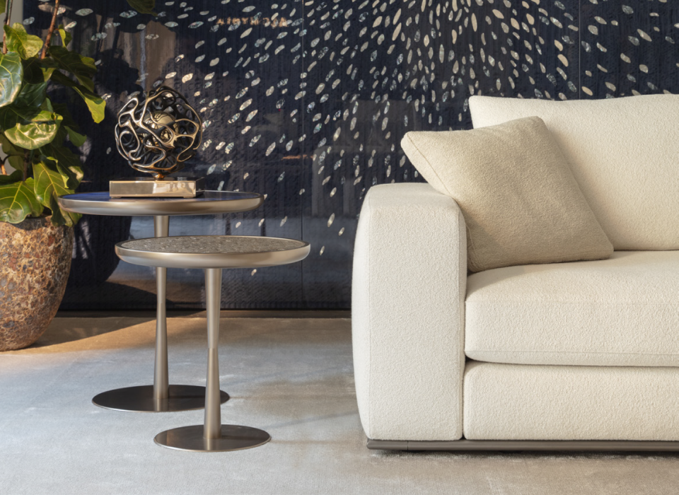 Inspired by the conceptual and experimental beauty of the historical and cultural context in the heart of Milan, the Durini atelier collection blends tradition and innovation, smoothing classical elegance with surprising colour and material accents. Visual and tactile examples are the Lunar finish of the Ios coffee table, which illuminates the space with its ethereal delicacy, and the accessory shelves in the Galaxy finish of the Floyd sofa, which add a scenographic touch, transforming the space into an artistic experience. Every detail tells of the versatility of a brand that has made the concept of customisation its own, where matter comes to life in a perfect balance of creativity and craftsmanship.