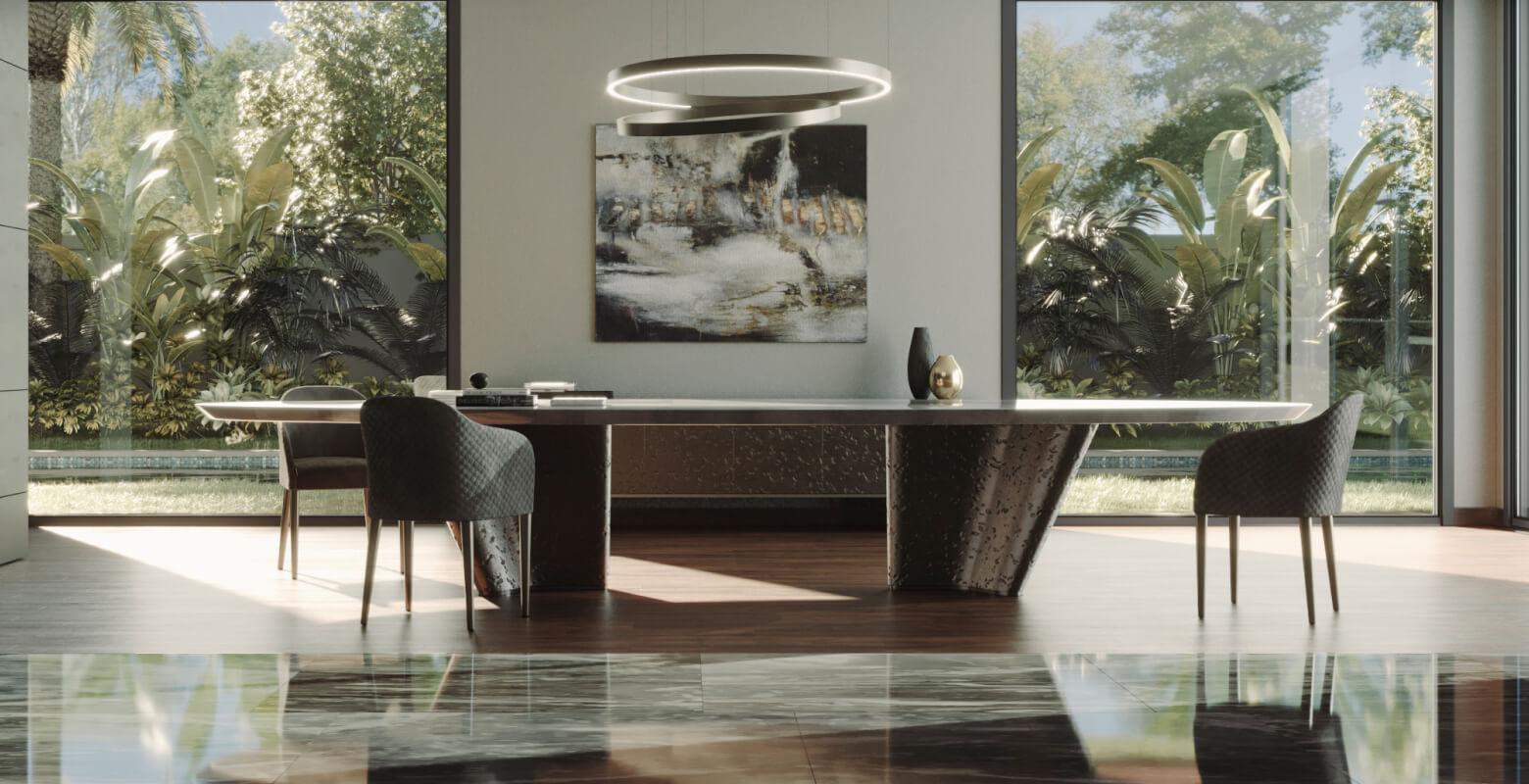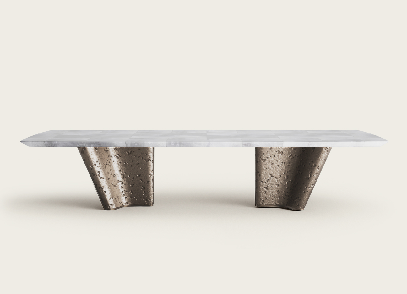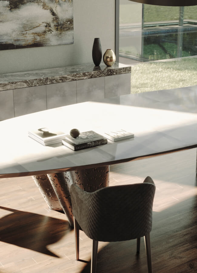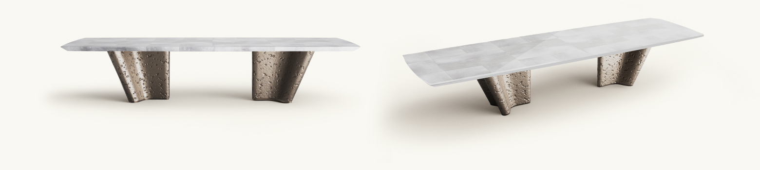 Etna table is a statement of original design, where strength and elegance converge in perfect harmony. Its sculptural base—defined by bold, inclined volumes finished in refined Lunar bronze—evokes the raw power of nature, reinterpreted through a lens of contemporary luxury. A table that does not simply furnish a room, but transforms it into a curated, decorative landscape.