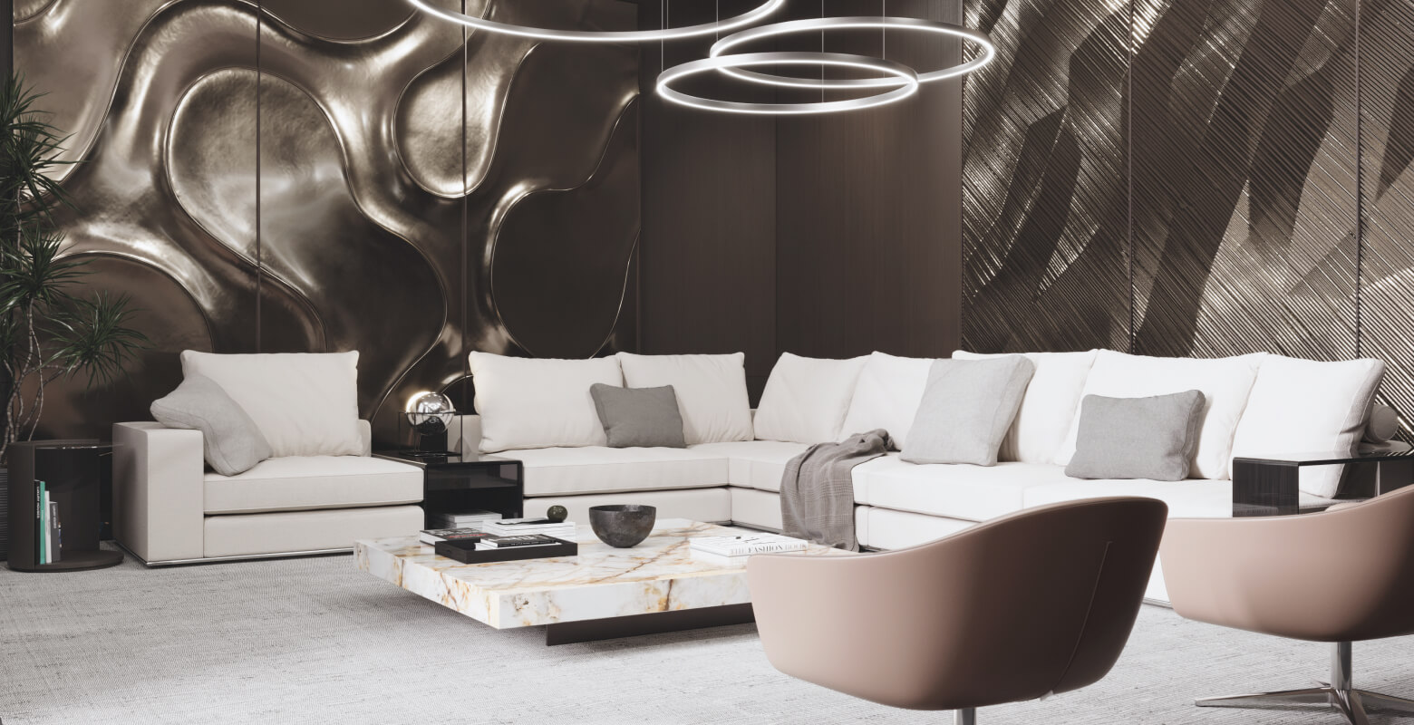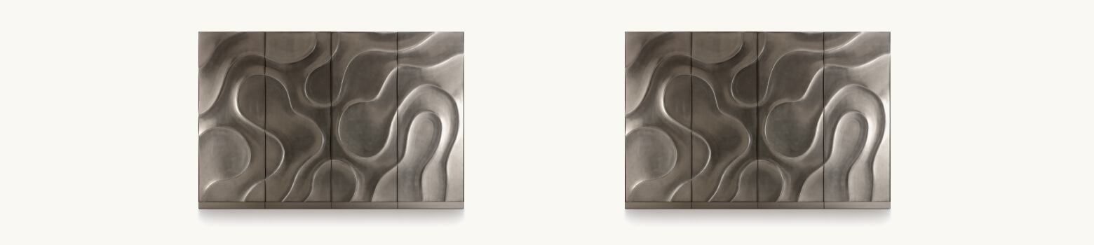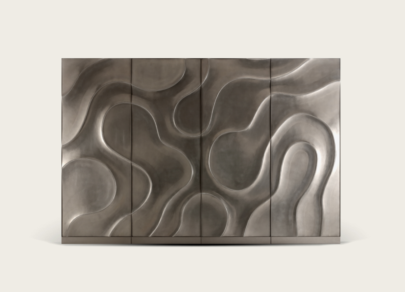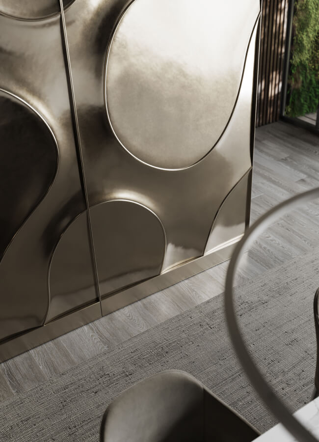 The Nebula wall decor redefines the perception of vertical surfaces through an original design that plays with curves, reliefs, and reflections. Its sinuous pattern, carved with precision, brings movement and fluidity to the composition, transforming the wall into a key architectural feature of contemporary luxury interiors.