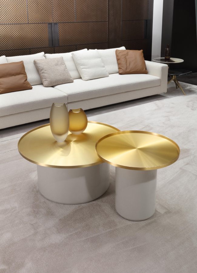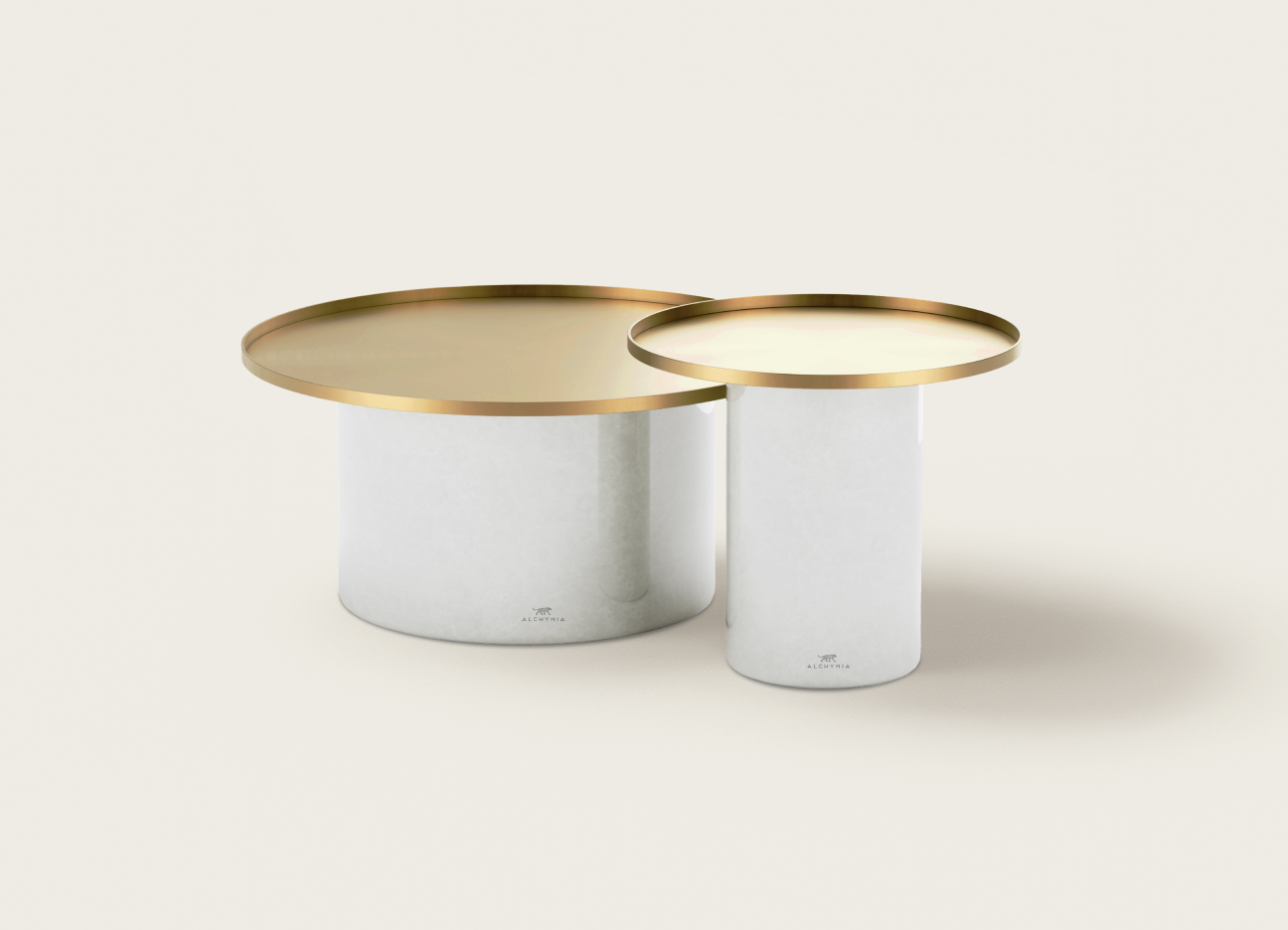 The Tray small table reveals a modern interpretation of decorative design. Its cylindrical lacquered base and radiant golden top create a bold contrast that feels both luxurious and minimal. The smooth metallic surface enhances the interplay of light, giving the piece a refined and original sculptural presence in any interior.